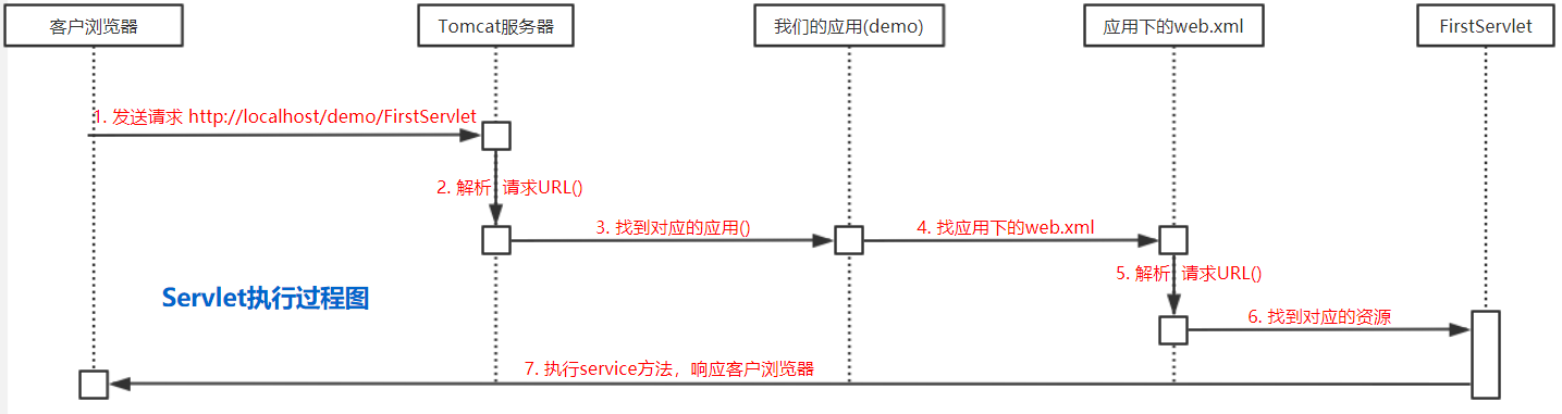 - 我们通过浏览器发送请求,请求首先到达Tomcat服务器,由服务器解析请求URL,然后在部署的应用列表中找到我们的应用。接下来,在我们的应用中找应用里的web.xml配置文件,在web.xml中找到FirstServlet的配置,找到后执行service方法,最后由FirstServlet响应客户浏览器。整个过程如下图所示: