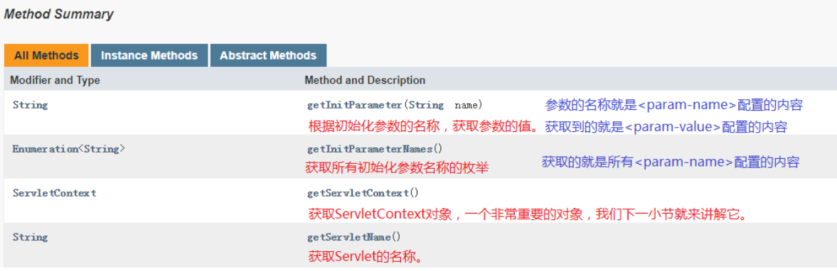 String getInitParameter(String name) : 根据参数名获取参数值 Enumeration<E> getInitParameterNames() : 获取该servlet中所有的参数名称 - 获取真实路径