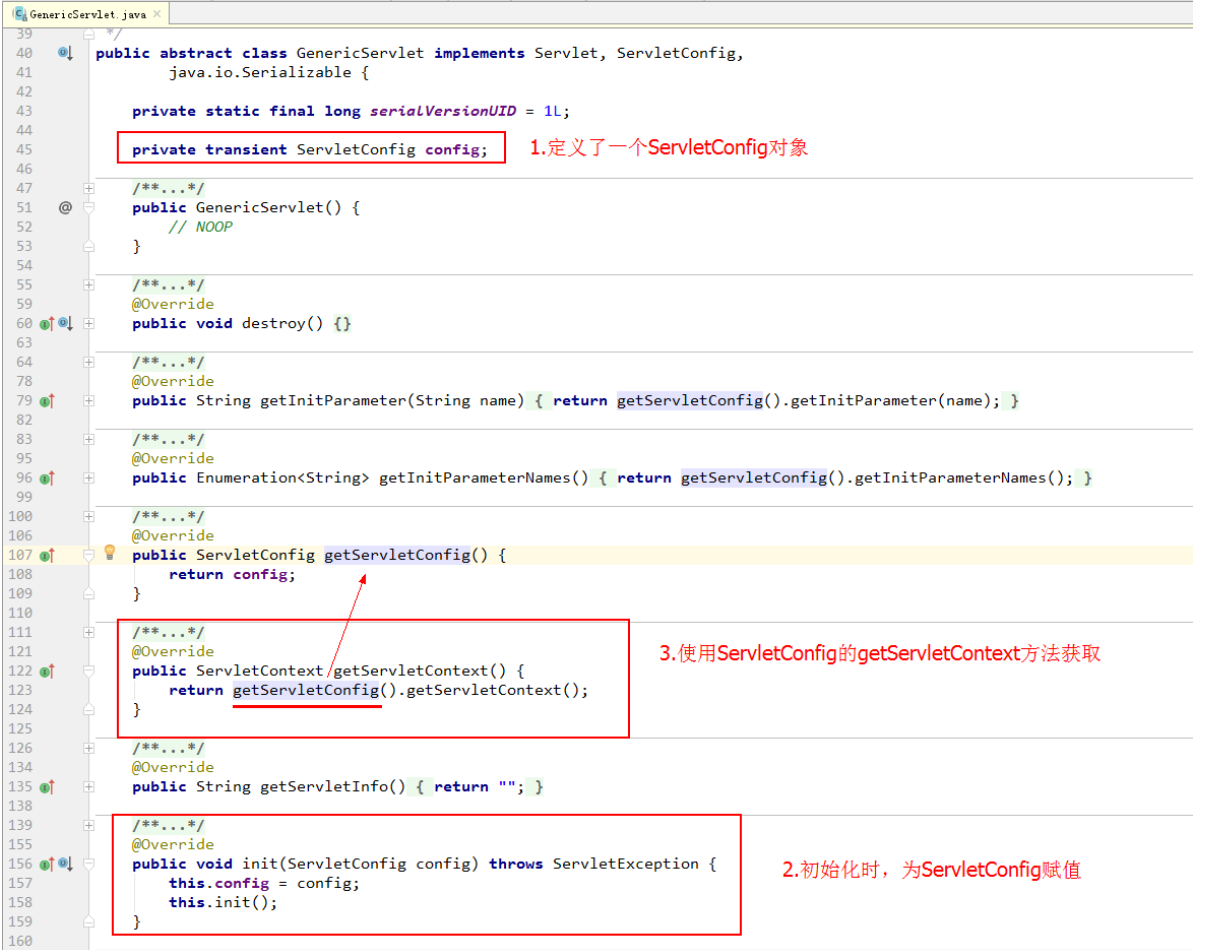 - 在实际开发中,如果我们每个Servlet对ServletContext都使用频繁的话,那么每个Servlet里定义ServletConfig,再获取ServletContext的代码将非常多,造成大量的重复代码。Servlet规范的定义中也为我们想到了这一点,所以它在GenericServlet中,已经为我们声明好了ServletContext获取的方法,如下图所示: