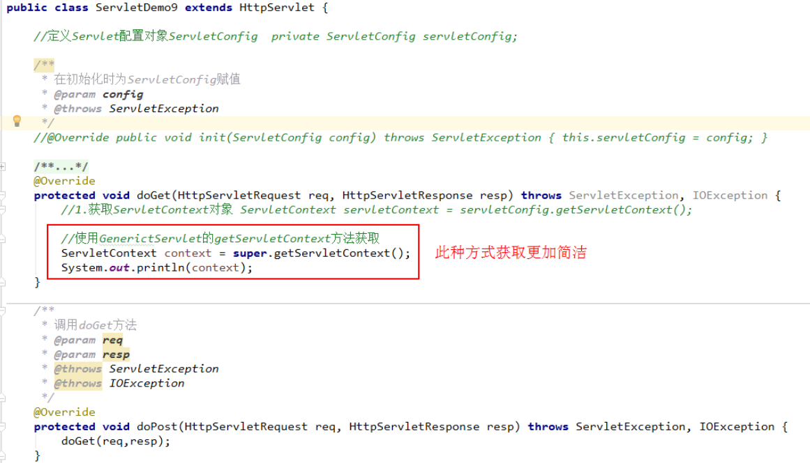 - 我们的Servlet都是继承自HttpServlet,而HttpServlet又是GenericServlet的子类,所以我们在获取ServletContext时,如果当前Servlet没有用到它自己的初始化参数时,就可以不用再定义初始化参数了,而是直接改成下图所示的代码即可: