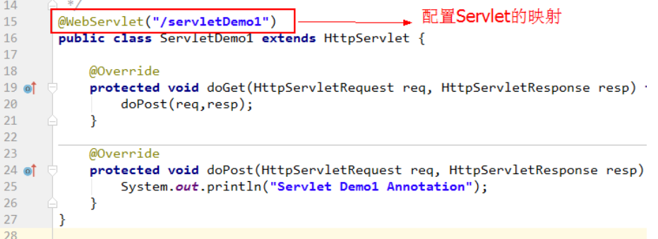 /* 注解开发Servlet */ public class ServletDemo1 extends HttpServlet { @Override protected void doGet(HttpServletRequest req, HttpServletResponse resp) throws ServletException, IOException { doPost(req,resp); } @Override protected void doPost(HttpServletRequest req, HttpServletResponse resp) throws ServletException, IOException { System.out.println("Servlet Demo1 Annotation"); } }- 第三步:使用注解配置Servlet
