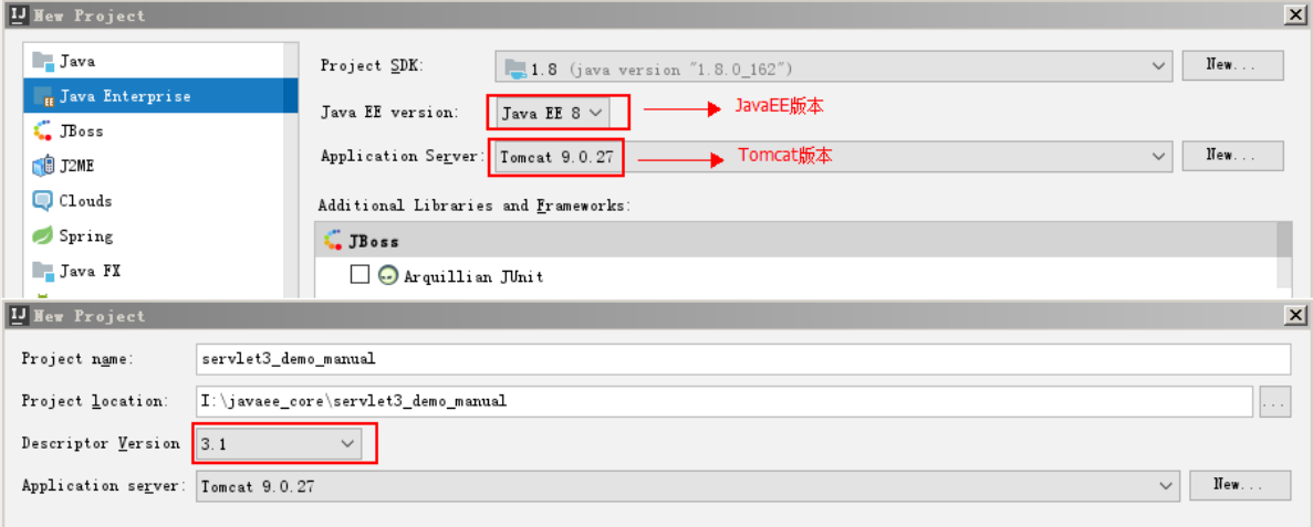 - 我在Tomcat和HTTP协议中已经介绍了,我们使用的是Tomcat9,JavaEE规范要求是8,对应的Servlet规范规范应该是JavaEE8包含的4.x版本。