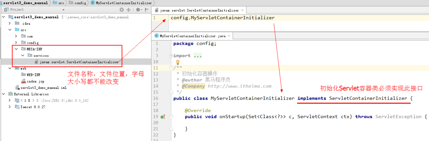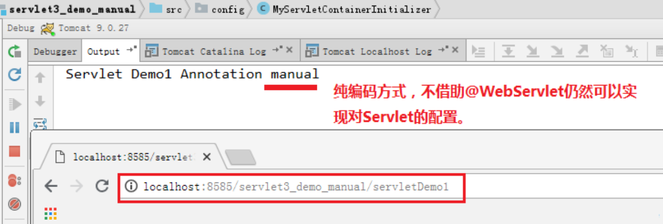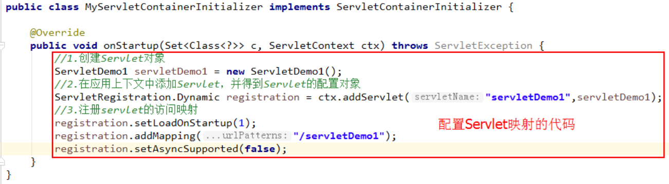 /* 注解开发Servlet 之 手动初始化容器 */ public class ServletDemo1 extends HttpServlet { @Override protected void doGet(HttpServletRequest req, HttpServletResponse resp) throws ServletException, IOException { doPost(req,resp); } @Override protected void doPost(HttpServletRequest req, HttpServletResponse resp) throws ServletException, IOException { System.out.println("Servlet Demo1 Annotation manual"); } }- 第三步:创建初始化容器的类,并按照要求配置