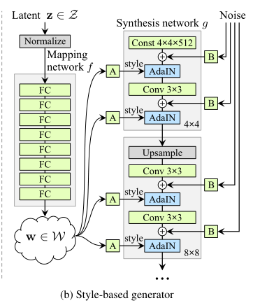 stylegan为下游生成任务提供了promising prior models,但是stylegan的the latent codes是全局的(如下图,stylegan中是latent z是经过Normalize 和FC 层得到的)。这并不能很好对生成图像进行 a fine-grained control。本文提出semanticstylegan是model local semantic parts separately,重点放在生成器的改进上(往下看,其实判别器也做了进步)。实现了符合latent z对应的structure and texture(文章实验部分对这里做了可视化,看着图感觉解的挺好)。后面就是吹自己做的好了