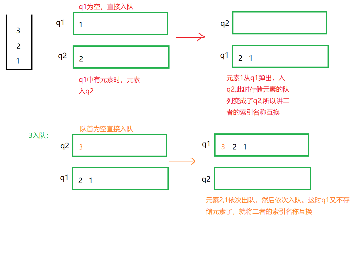 //互换之后,q1任然是存储元素的队列,q2为空