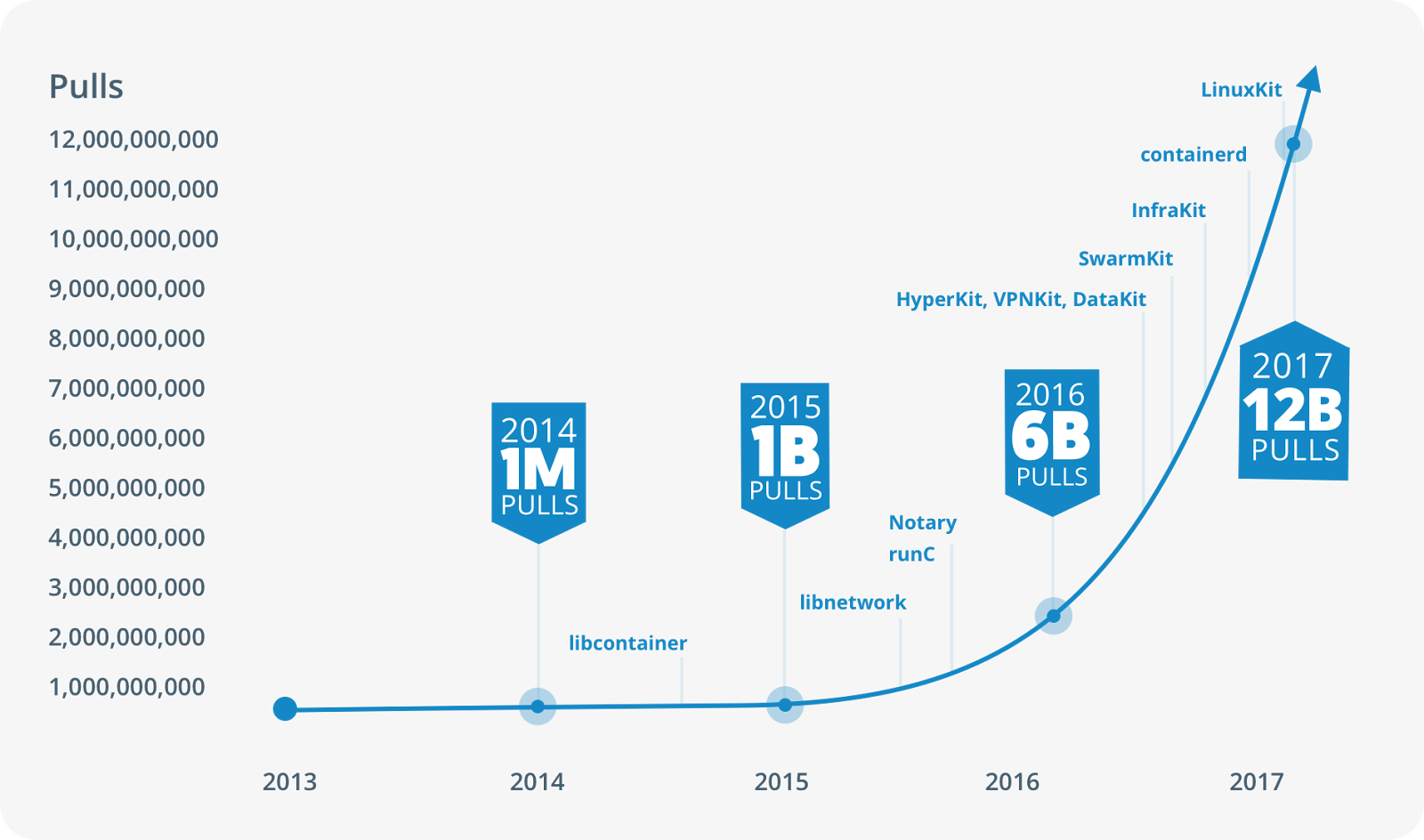希望大家没有被文中众多的名称和概念搞糊涂,让我们以下图来结束本文,它展示了从 2013 年到 2017 年从 docker hub 拉取镜像次数的趋势: