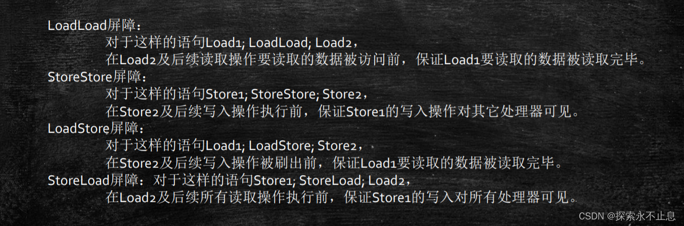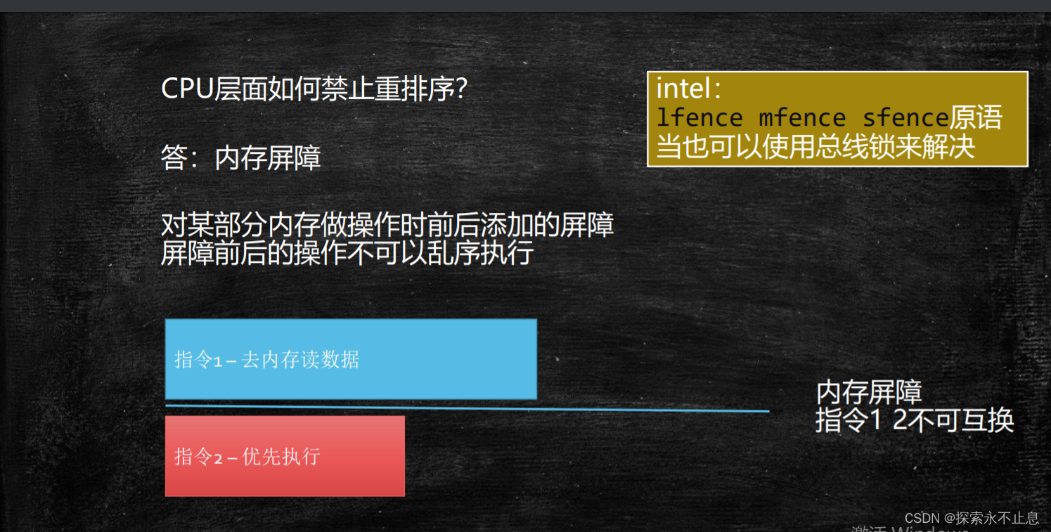 2.缓存一致性协议,在缓存一致性协议中,最出名的就是Intel的MESI协议,MESI的大致思想是,当CPU操作的变量是一个共享变量时,说明其他的CPU缓存中也可能会存在副本,那么这时候对该共享变量的读操作不做限制,照常读取数据,只是在写入的时候,会发出信号告诉其他的CPU将这个变量的Cache line设置为无效状态,那么其他的CPU在对该变量做读取时,由于缓存中的该变量已经失效,那么就会重新到主内存中读取。