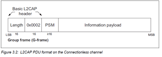 2、CONNECTIONLESS DATA CHANNEL IN BASIC L2CAP MODE(Group frame即G-frame),格式如下图所示:
