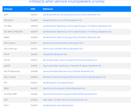 (3)PSM(>=2个字节):即Protocol/Service Multiplexer,其实就是上层协议的Assigned Numbers