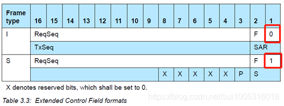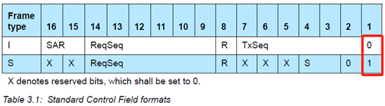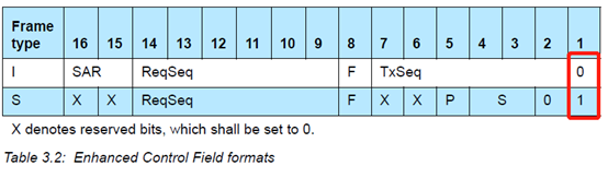 S-frame的Control字段组成:ReqSeq(接收序列号)、R(重发标志位,用来表示I-frames是否需要被重发,只有Standard Control有这个字段)、P和F(用于Poll/Final功能,只有Enhanced Control和Extended Control有这个字段)、区分标志位(用于与I-frame进行区分,即图中红框中bit)、S标志位(表示S-frame的类型:RR、RNR、REJ、SREJ中的一种)