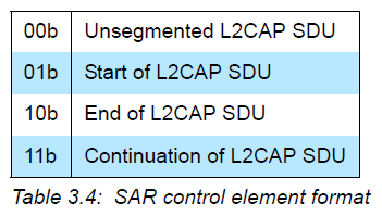 (d)Segmentation and Reassembly - SAR (2 bits):表示一个L2CAP SDU是否被分割