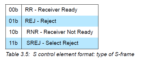 (e)Supervisory function - S (2 bits):表示S-frame的类型,有4种类型RR(Receiver Ready)、REJ (Reject)、RNR (Receiver Not Ready)和SREJ(Selective Reject),如下图所示: