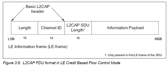 (3)L2CAP SDU Length Field(2个字节):当一个SDU被分为多个片段时,存放第一个片段的LE-frame中需要有这个字段,表示SDU的总长度,存放其余片段的LE-frame不能有这个字段