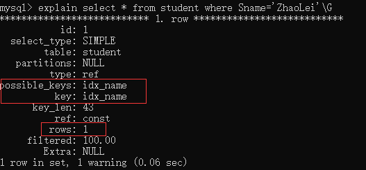 添加索引之后,再次查询 "ZhaoLei" 信息,只在表中查询一行数据即可得到,