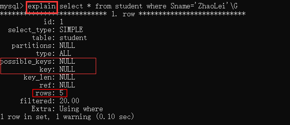 rows=5表示查询了5条数据,即进行了全表查询,当前查询操作对每一行数据都进行比较。