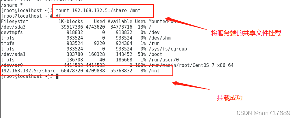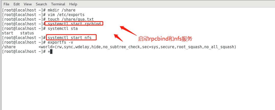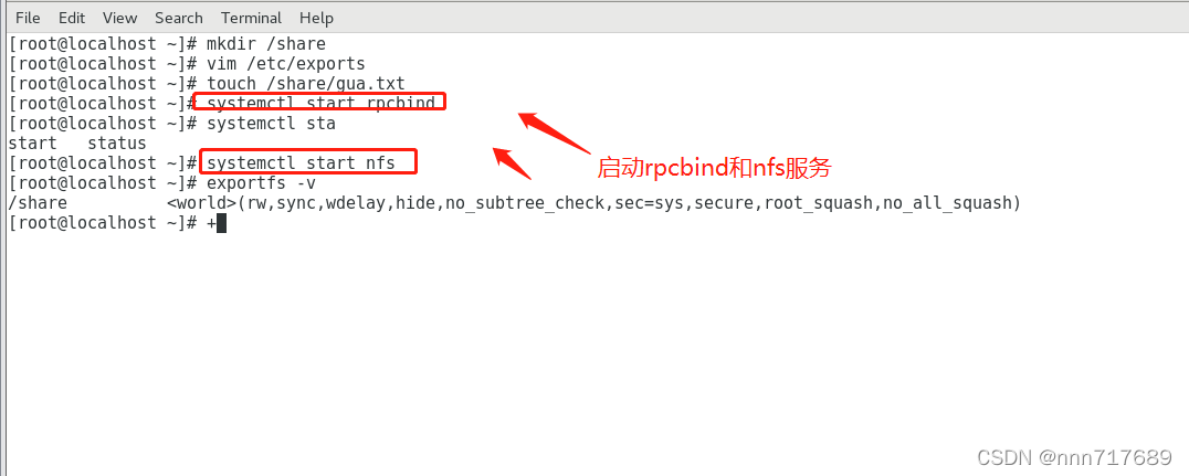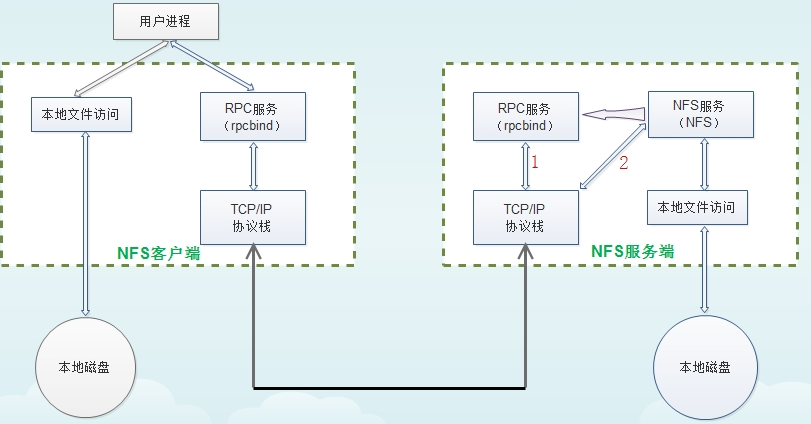 NFS 服务的实现依赖于 RPC(Remote Process Call,远端过程调用)机制, 以完成远 程到本地的映射过程。在 CentOS 7 系统中,需要安装 nfs-utils、rpcbind 软件包来提供 NFS 共享服务, 前者用于 NFS 共享发布和访问,后者用于 RPC 支持。 手动加载 NFS 共享服务时,应该先启动 rpcbind,再启动 nfs。