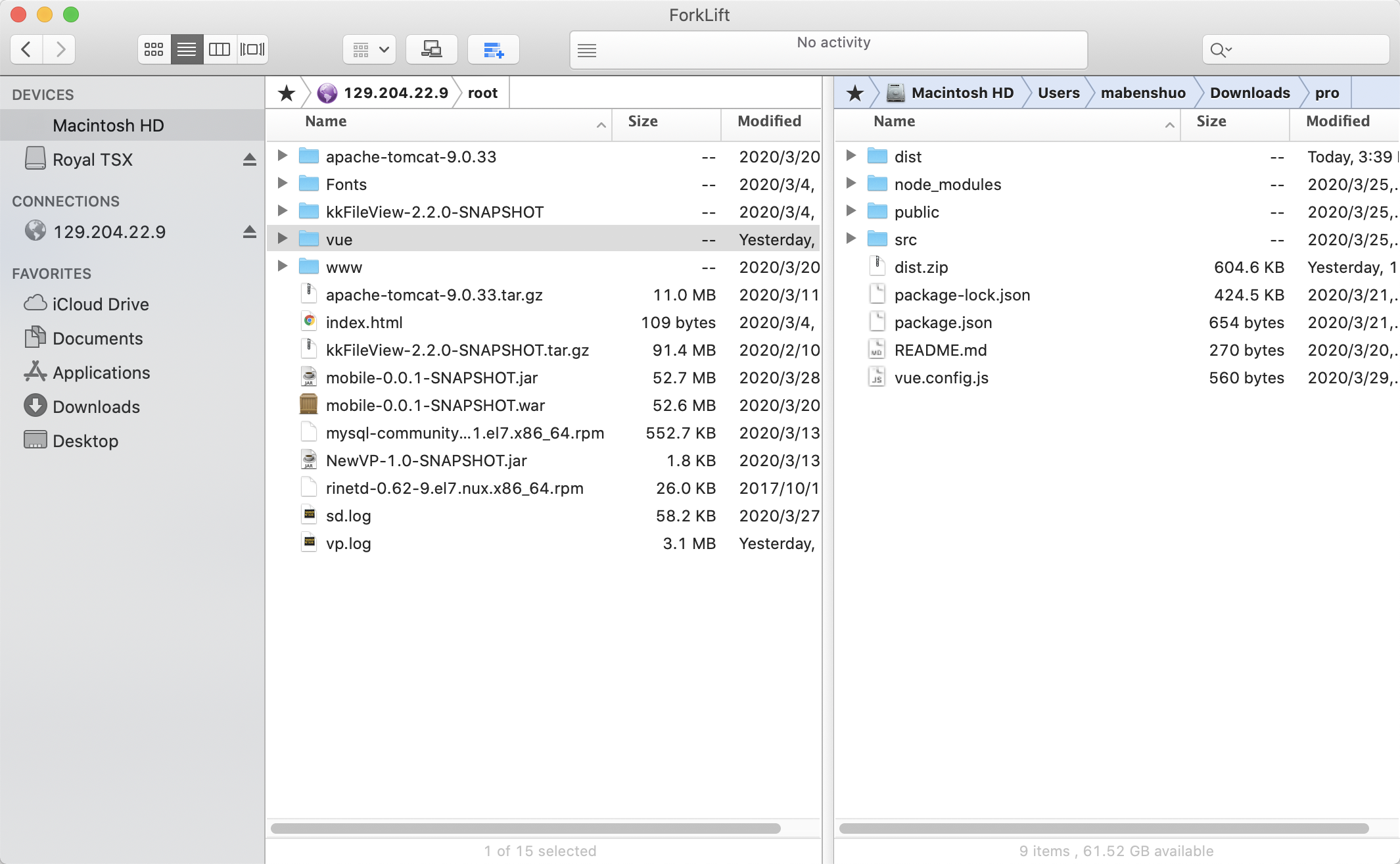 在之前的工作中,因为没有独立开发过,都没用过类似的项目上线工具,然后呢,之前的windows电脑太卡了,新买的电脑又是mac,所以就不知道mac的上线工具,在网上查了许多,说的都是使用苹果自带的优秀的命令行,但是我看见那个黑框头晕,就一直查,好多软件都收钱(穷),最后终于在B站看到的一位专门介绍mac使用技巧的程序员,有一个视频是讲Royla TSX的,挺好用的,免费版的只可以创建一个document,我一直用了一个星期,然后那一天不小心关闭了软件,然后,就找不到我的document了,然后,这个软件就费了,我看不懂英文,不知道怎么挽救,就找了一个其他软件,ForkLift,谁知发现宝贝,这个更好用。。。
