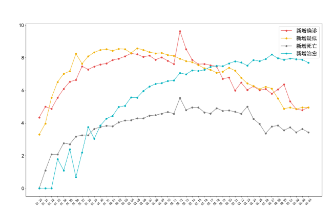 数据分析视角:由于存在一个离散点,使得折线图其他部分的视觉上波动不明显,不易于发现数据规律。但是由于面向对象是普通大众,这种展示方式比较符合大众思路,而且由于是疫情信息,每多做一种变换处理,都有可能带了不确定的政策风险,这种思路比较稳妥。