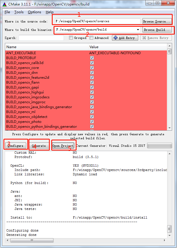 接着就执行cmake的第五步,打开vs2017,完成下面配置,开始编译
