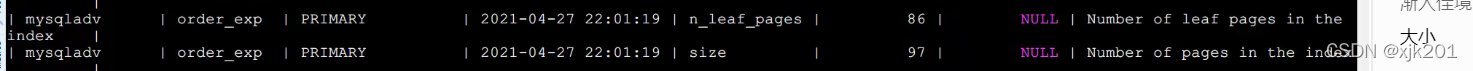 clustered_index_size的值是97,表明order_exp表的聚簇索引占用97个页面,这个值是也是一个估计值。