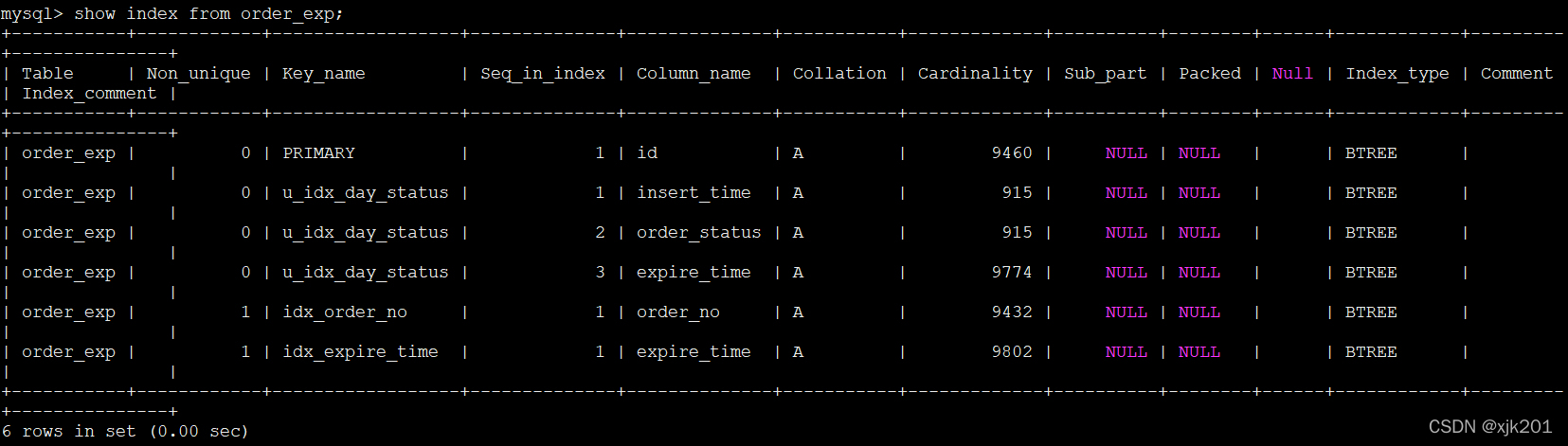 先查看index_name列,这个列说明该记录是哪个索引的统计信息,从结果中我们可以看出来,PRIMARY索引(也就是主键)占了3条记录,idx_expire_time索引占了6条记录。