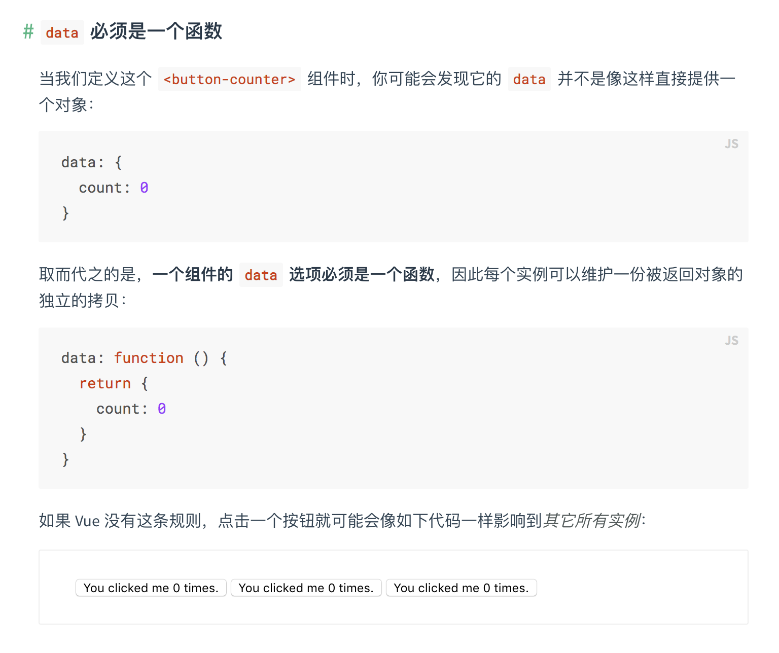 所以说vue组件的data必须是函数。这都是因为js的特性带来的,跟vue本身设计无关。