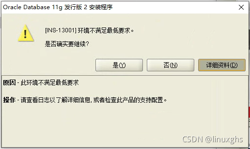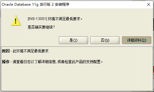 今天给客户的电脑安装oracle11的时候,出现INS-13001环境不满足最低要求,如下图提示: