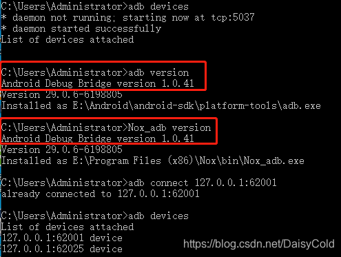 替换完成后,使用命令adb version和Nox_adb version 查看SDK和模拟器的adb版本是否一致。若一致,重新打开模拟器使用命令adb connect 127.0.0.1:62001连接模拟器即可。