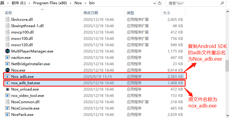再将模拟器adb路径下的nox_adb.exe文件重命名为nox_adb_bat.exe,再复制一份Android SDK的adb.exe文件到模拟器adb路径下并重命名为Nox_adb.exe