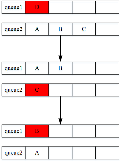 (2)之后进行删除操作。按照栈的先进后出的规则,我们需要先删除元素D,但是此时队列queue1中D在队尾,不能直接进行出队操作,所以此时我们需要借助队列queue2来使得元素D到达某个队列的队首,这样就能进行出队操作已达到删除的目的。按照同样的规则,依次删除元素D、C、B。完成之后,队列中只有一个元素A了,而此时元素A在队列queue2中。