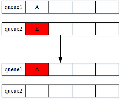 (4)接下来再考虑删除元素的话,需删除元素E。按照相同的规则,将queue2中的队首元素A出队并进入到队列queue1中,然后对queue2中的元素E执行出队操作。接下来也可直接删除元素A。