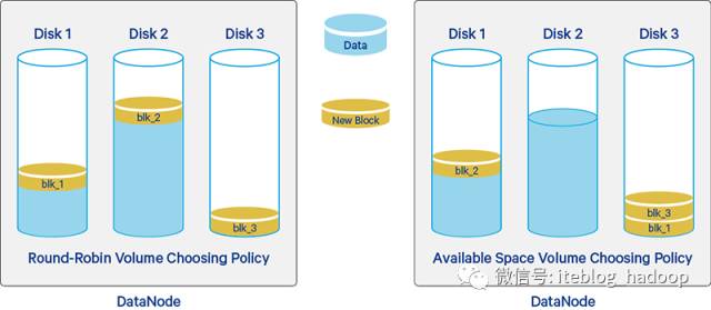 循环(round-robin)策略将新块均匀分布在可用磁盘上;而可用空间( available-space )策略优先将数据写入具有最大可用空间的磁盘(通过百分比计算的)。正如下图所示:
