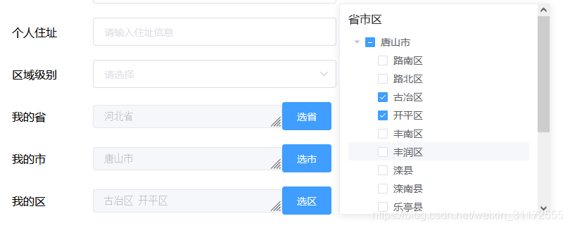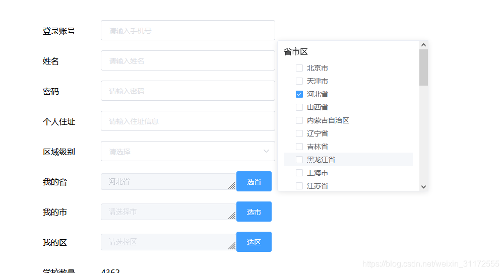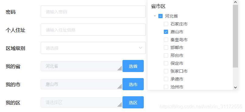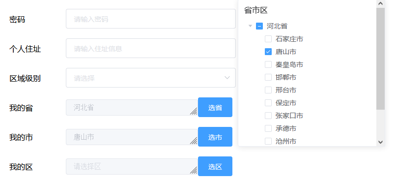 项目中需要使用tree来展示、提交、回显省市区信息。因为数据库的省市区信息总共有两千多笔,因此一次全部显示可能会出现渲染时间长的问题,最初考虑到使用懒加载,但回显出现问题(技术有限,没有找到其他人分享的经验),最终将需求拆分成省,省市,市区三个小模块,直接请求数据库。以下为相关页面和代码