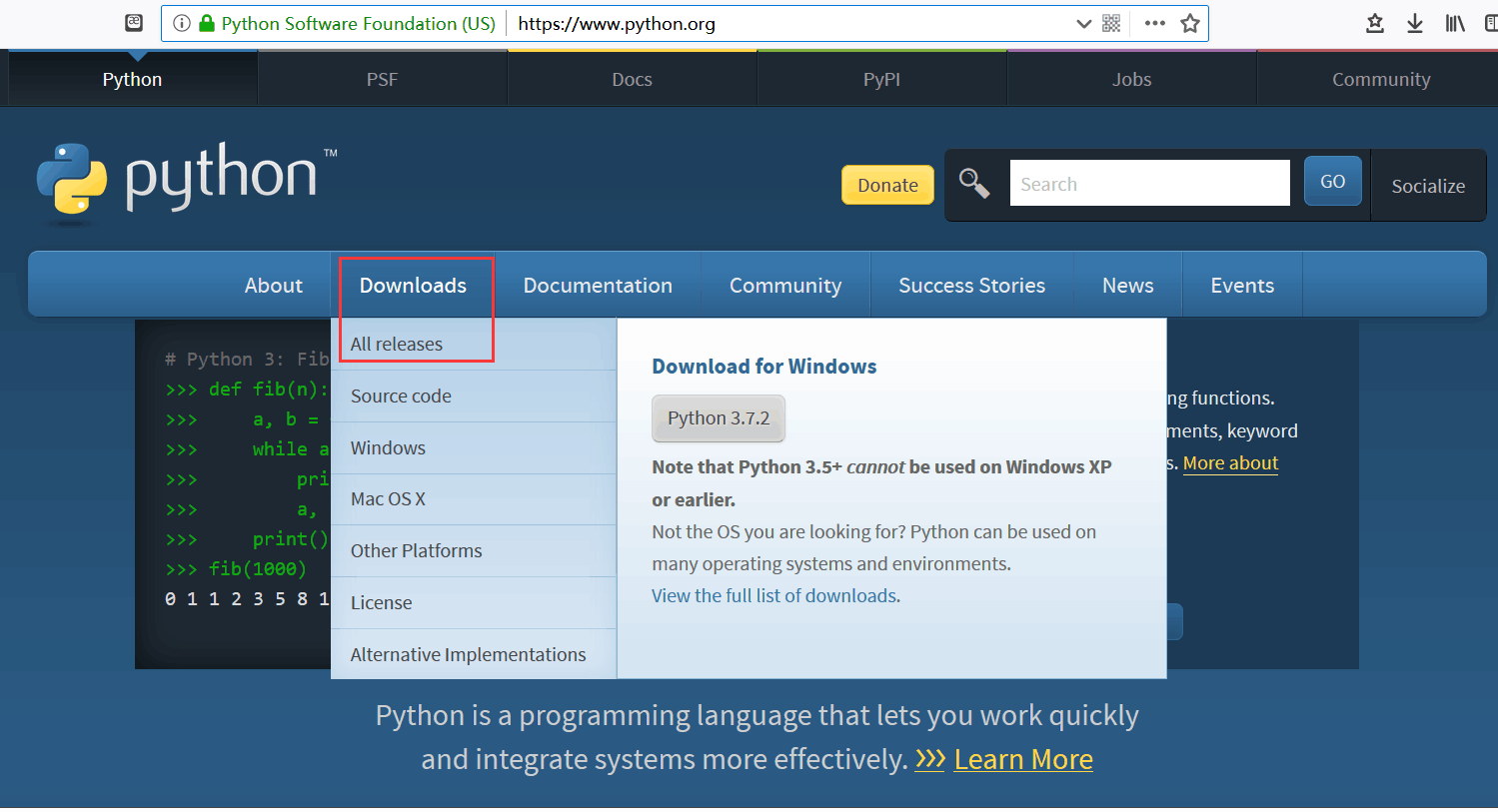 1.进入python官网进行下载:https://www.python.org/。选择3.5或3.6版本下载即可。