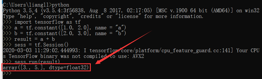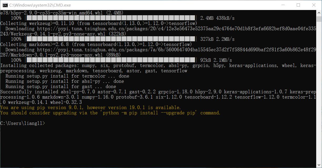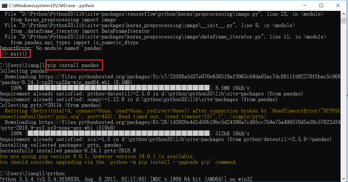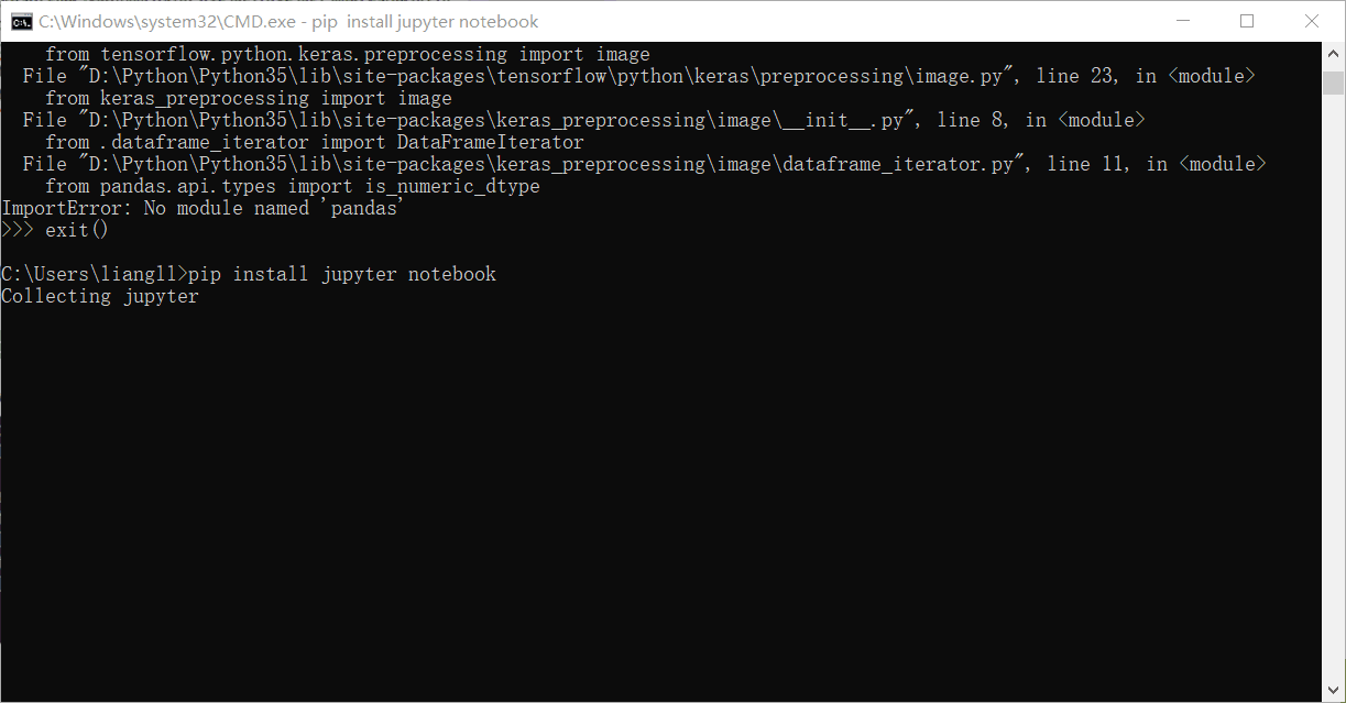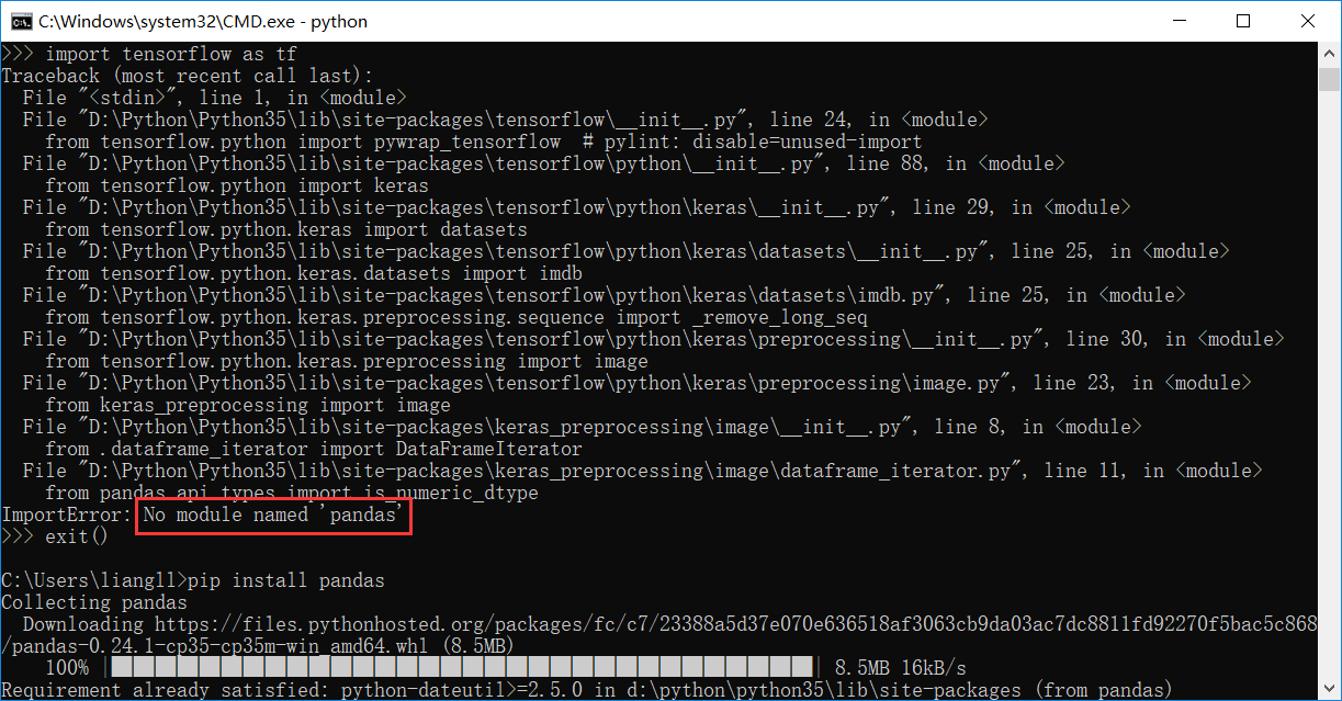 注意:安装tensorflow可能出现缺失相关packages现象,例如我的——缺少了'pandas'包