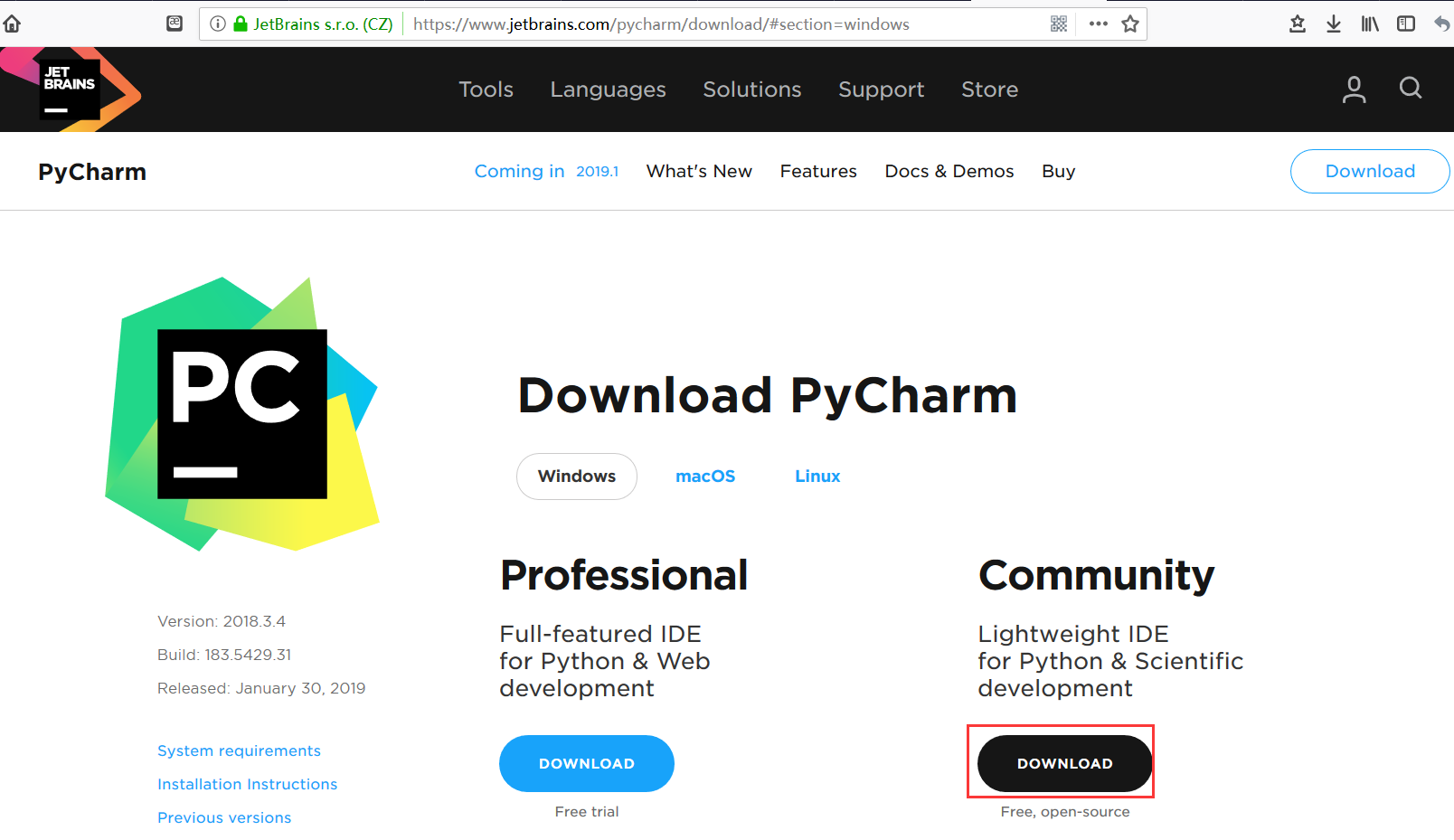 进入官网“https://www.jetbrains.com/pycharm/download/#section=windows”,选择Community版本下载即可