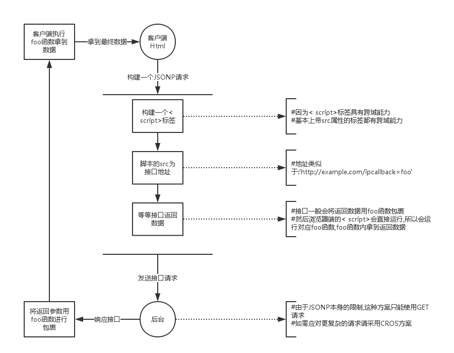 JSONP之所以能够用来解决跨域方案,主要是因为 <script> 脚本拥有跨域能力,而JSONP正是利用这一点来实现。具体原理如图