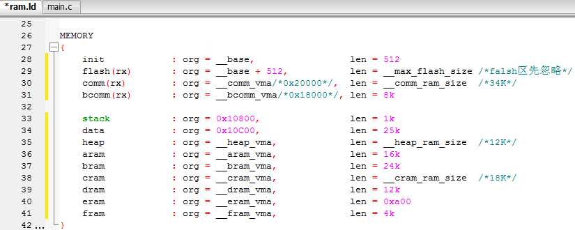 ram.ld文件:是RAM或FLASH空间分配的规则,工具链中的链接器按ram.ld中的规则分配程序或ram占用的空间。