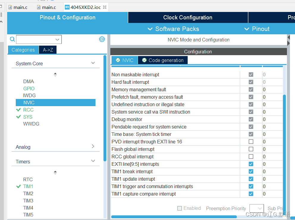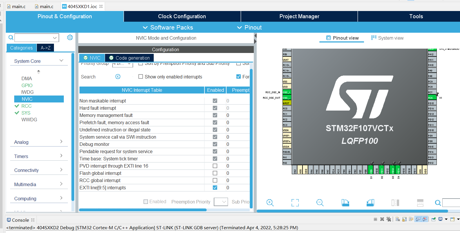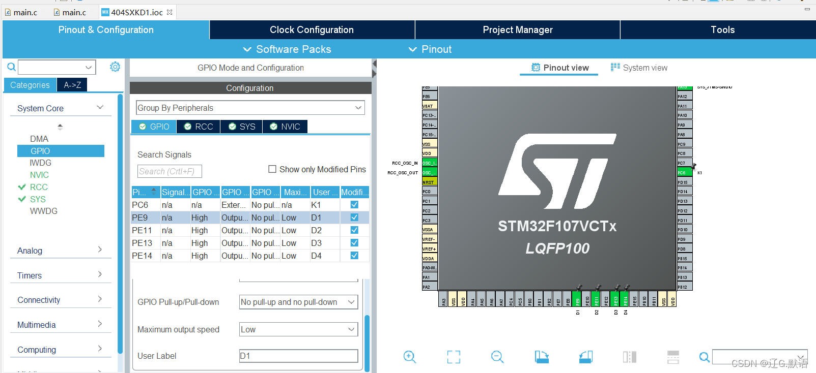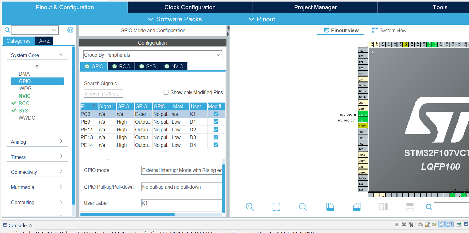 具体实操:这个不需要配置定时器等,只需要打开外部中断即可。然后我们先配置一下最基础的,备注一下led引脚和外部中断按键引脚。我之前文章中讲到过如何配置,我这里简单展示和讲解。我用的是STM32F107VCT6的板子,所以对应的引脚是PE9 PE11 PE13 PE14 外部按键对应的引脚是PC6,大家根据自己板子的原理图进行配置,我这里给它们分别备注为D1,D2,D3,D4和K1,方便我们引用。然后再NVIC中打开外部中断。