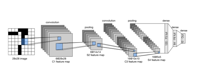从上图可以看出,LeNet网络:(1)输入是一个28×28的图像;(2)卷积层1:卷积核大小为5×5,kernel_size=6,输出是28×28;(3)polling层1:卷积核大小为2×2,kernel_size=6,输出是14×14;(4)卷积层2:卷积核大小为5×5,kernel_size=16,输出是10×10;(5)polling层2:卷积核大小为2×2,kernel_size=16,输出是5×5;(6)卷积层3:卷积核大小为5×5,kernel_size=120,输出是1×1;(7)全连接层1;(8)输出层;