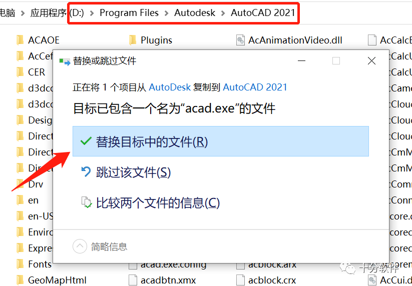 13. 将复制的acad.exe文件,粘贴到该目录下,点击替换目标中的文件