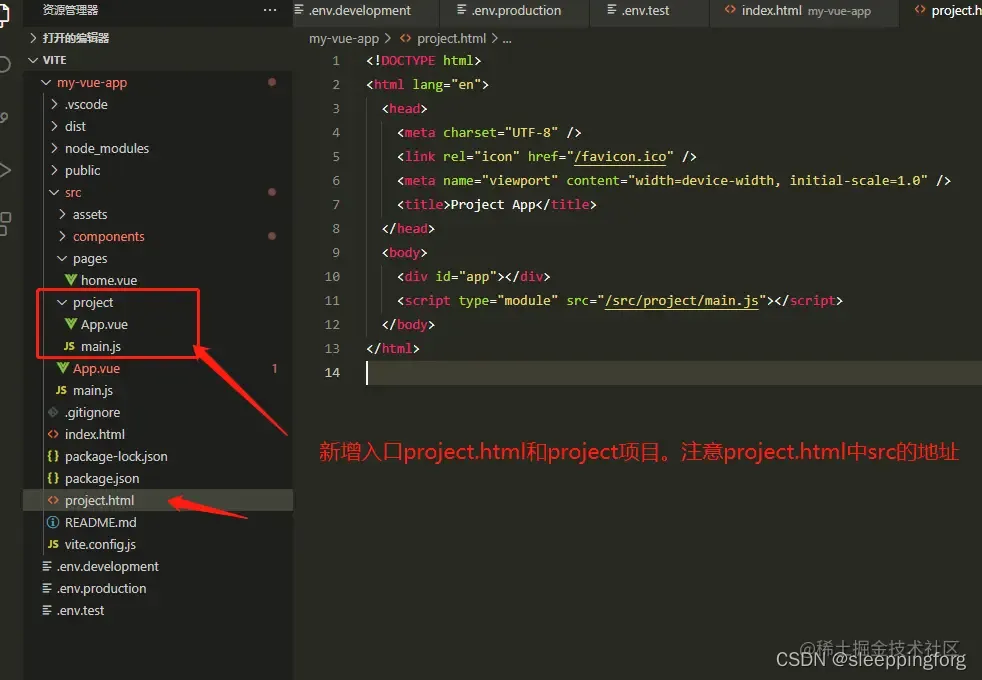 step1:在根目录新建一个入口页面以project.html为例,同时在根目录下新建一个project文件夹,在此文件夹新建一个main.js,App.vue