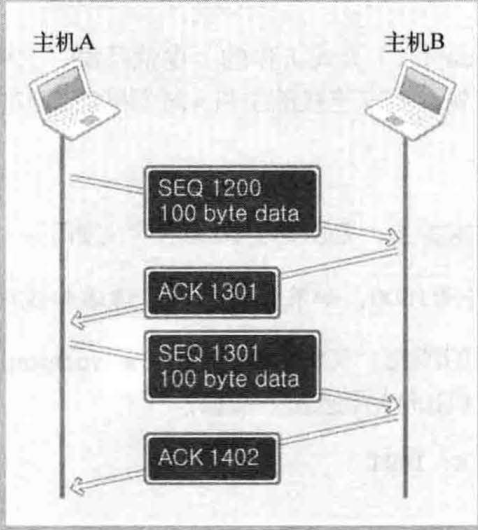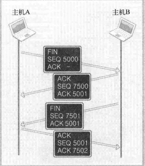 上图2-6中,报文段内的 FIN 表示断开连接。也就是说,双方各发送1次 FIN 报文段后断开连接。此过程经历4个阶段,因此又称四报文握手(Four-way handshaking)。SEQ 和 ACK 的含义与前面讲解的含义一样。在上图2-6中,主机B向主机A传递了两次 ACK 5001,这是因为第二次FIN 报文段中的ACK 5001 只是因为接收ACK消息后未接收数据而重传给主机A的,以便其在要发出的第四个确认报文段中知晓自己的SEQ。