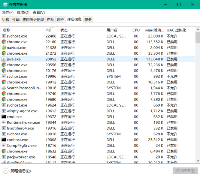第四步,打开任务管理器,如果在进程中没有找到java.exe就点击详细信息,找到PID为17804对应的java.exe点击结束任务