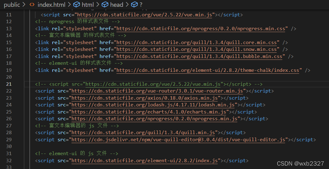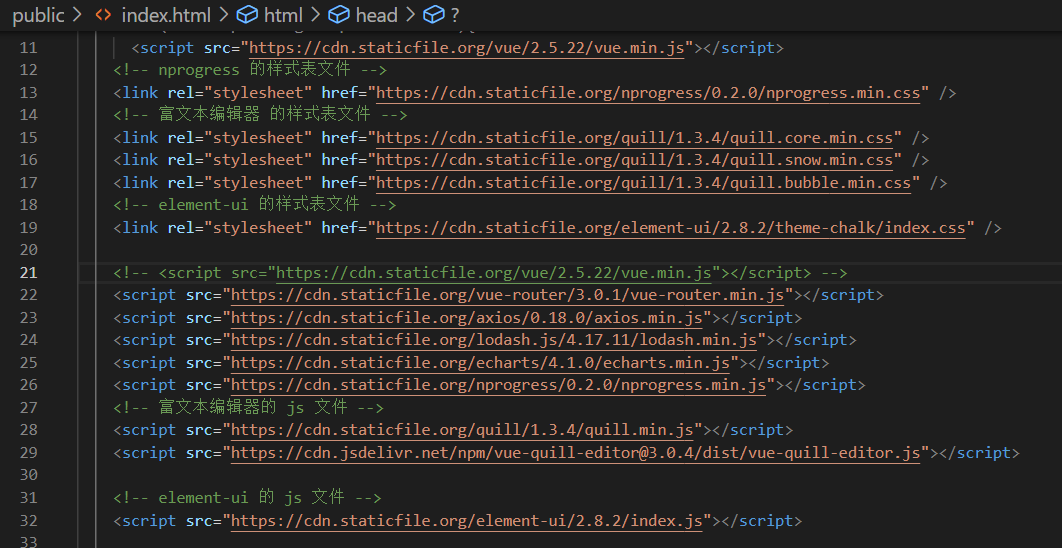 })第二步:在public/index.html文件的头部设置CDN文件:
