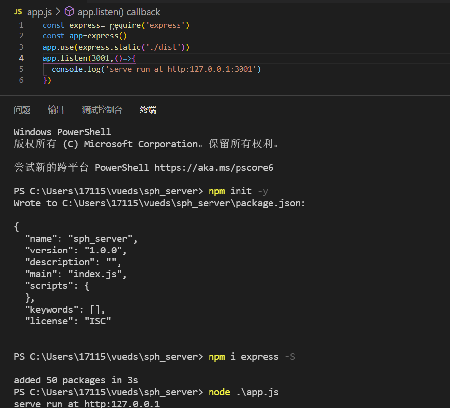 1创建node项目,并安装express快速创建node服务器,将vue打包后生成的dist文件托管为静态资源,
