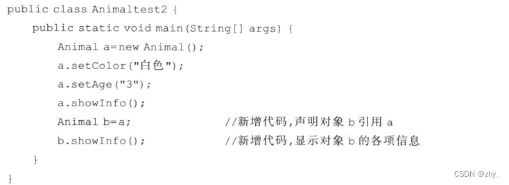 3.若在上面例子基础上修改:声明一个新的 Animal 对象 b ,但不创建该对象,而是引用 a 对象 。代码如下: