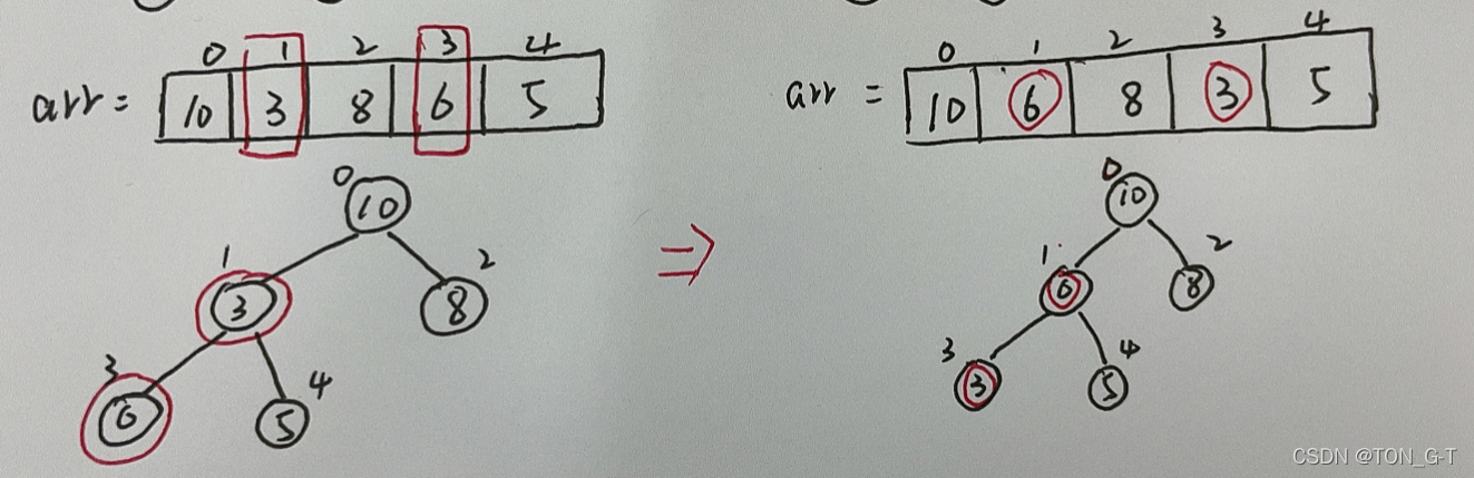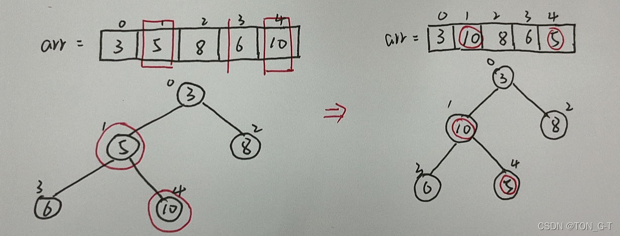 比较非叶子结点的左右结点,先让6,10比较,得到大的,再和当前结点5作比较,发现10大于5,则交换位置。
