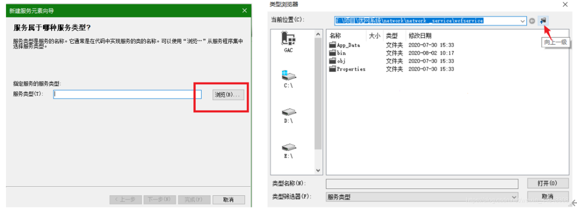 点击创建服务之后会弹出这个框,然后就点击浏览,点击向上一级就会看到BLL,双击bin---Debug---Bll.dff,一直按顺序点进去就会看到你所新建的服务