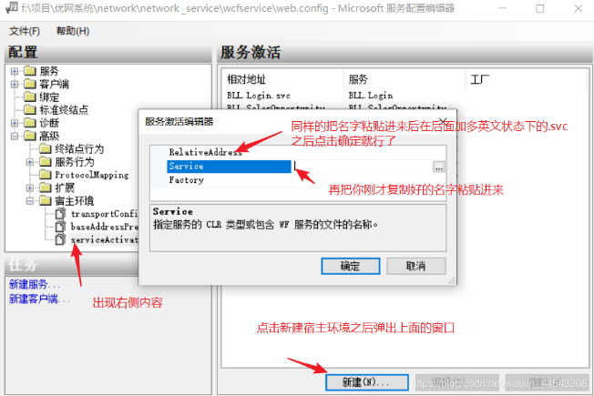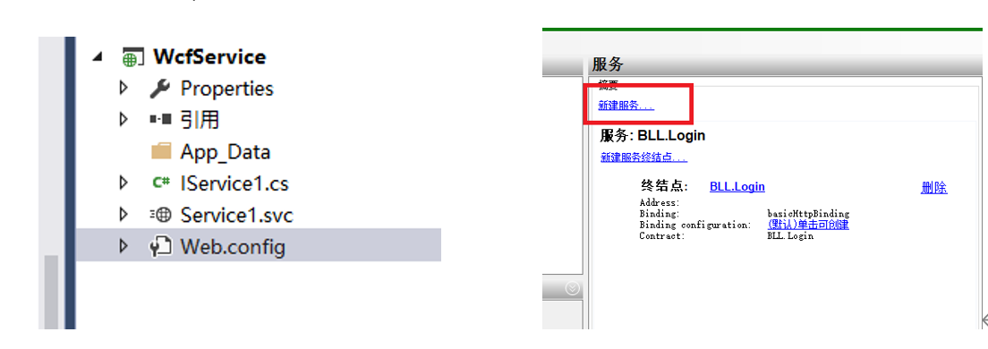 新建一个服务,选中Web.config,右键选择编辑WCF配置 ,进去之后会看到这个界面,然后点击新建服务,创建服务